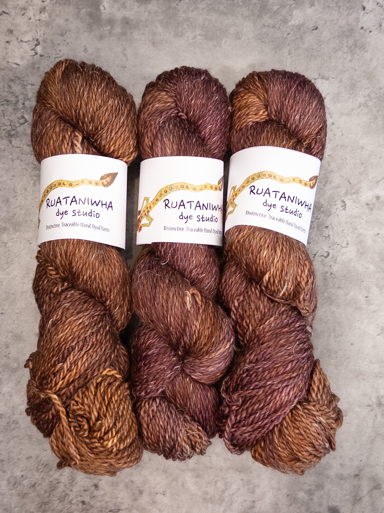 Hand dyed in New Zealand by Stephanie Win of Ruataniwha Studios. Inspired by growing up with the sheep that her parents farmed overlooking the Ruataniwha Inlet in Golden Bay. This yarn is soft to the touch and will be perfect for a variety of projects from shawls to garments.