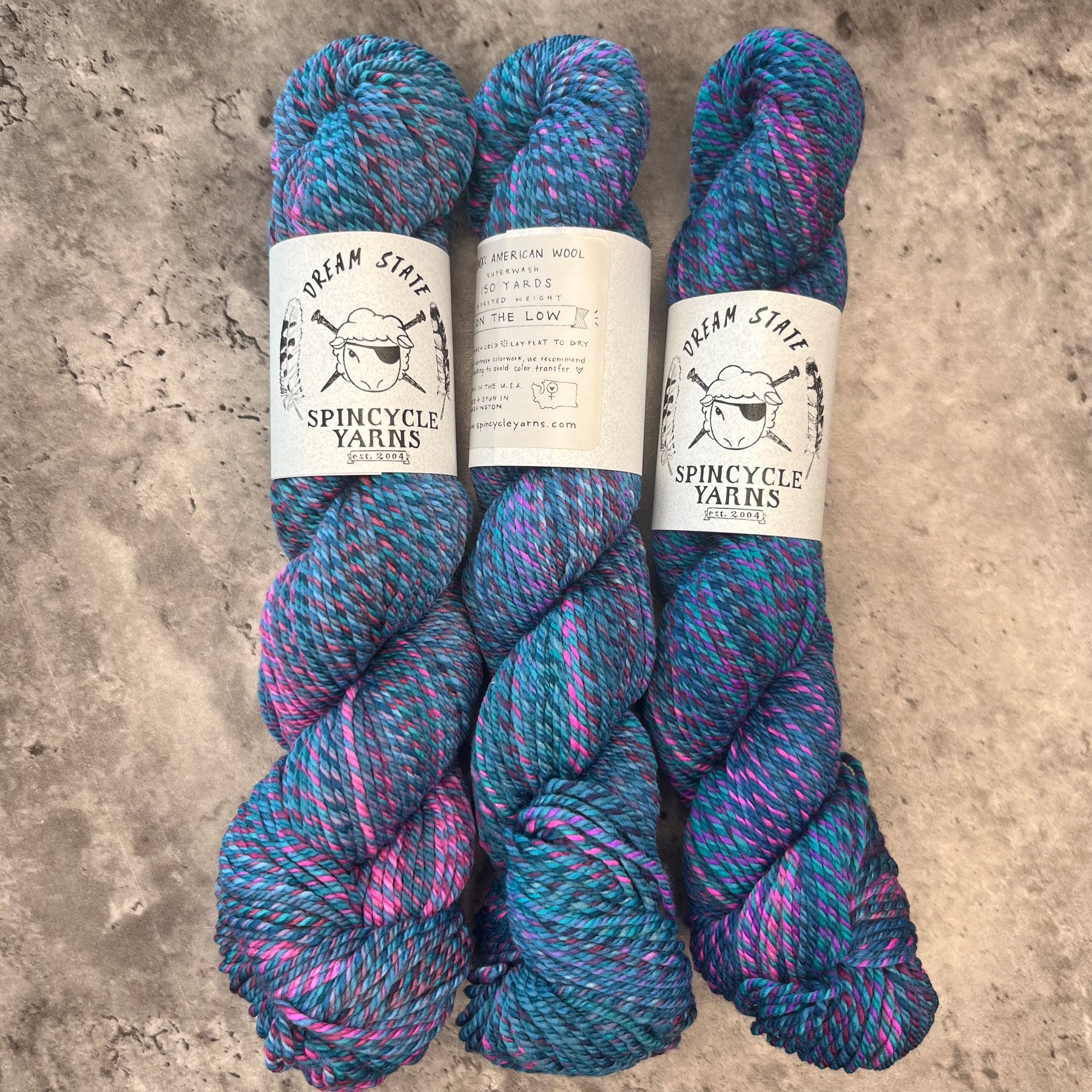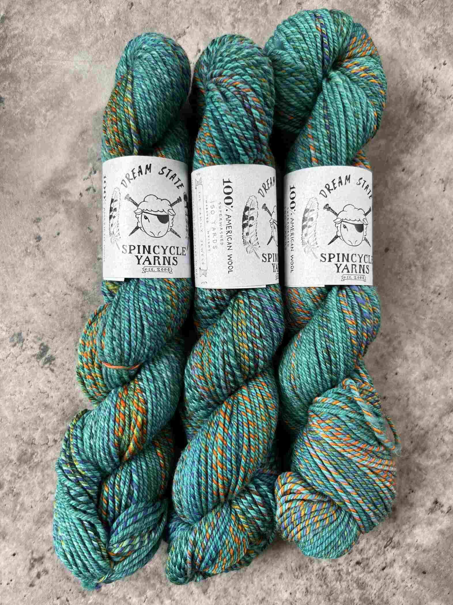 The team at Spincycle Yarns began as a hand-spinnery, but they wanted to find a way to merge the beauty and texture of a hand-spun yarn with a more efficiently produced mill spun yarn. That's how they created Dyed In The Wool, which was followed up with it's worsted weight cousin Dream State.