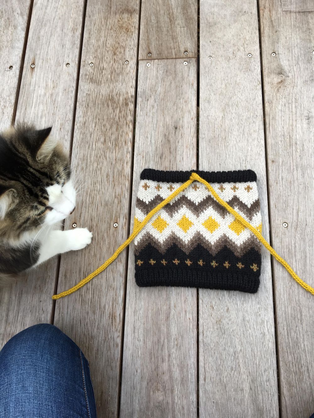 It is knit from the bottom up, with a folded hem and an i-cord drawstring, and a chart for the colorwork.
