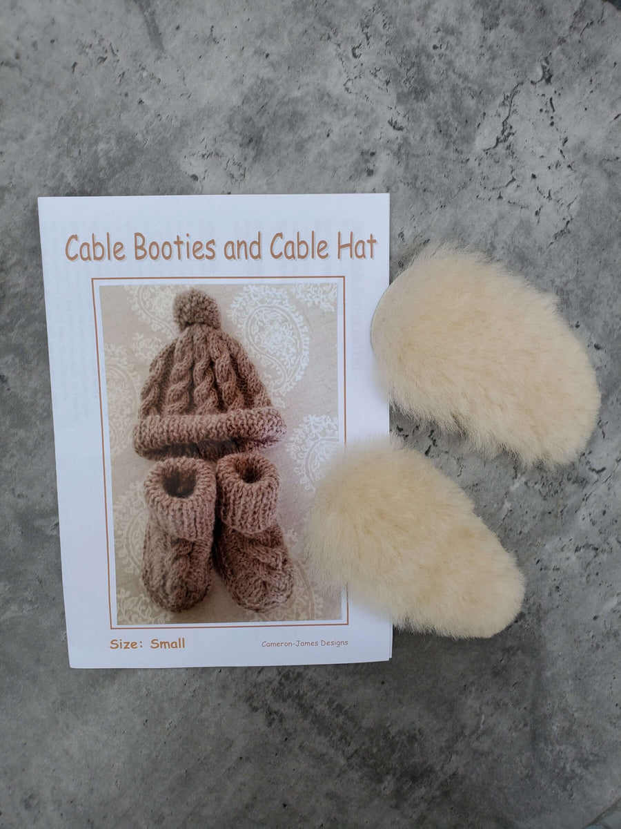 This kit includes the pattern for these cute and cosy cabled beanie and booties, plus sheepskin soles to keep baby's feet toasty.