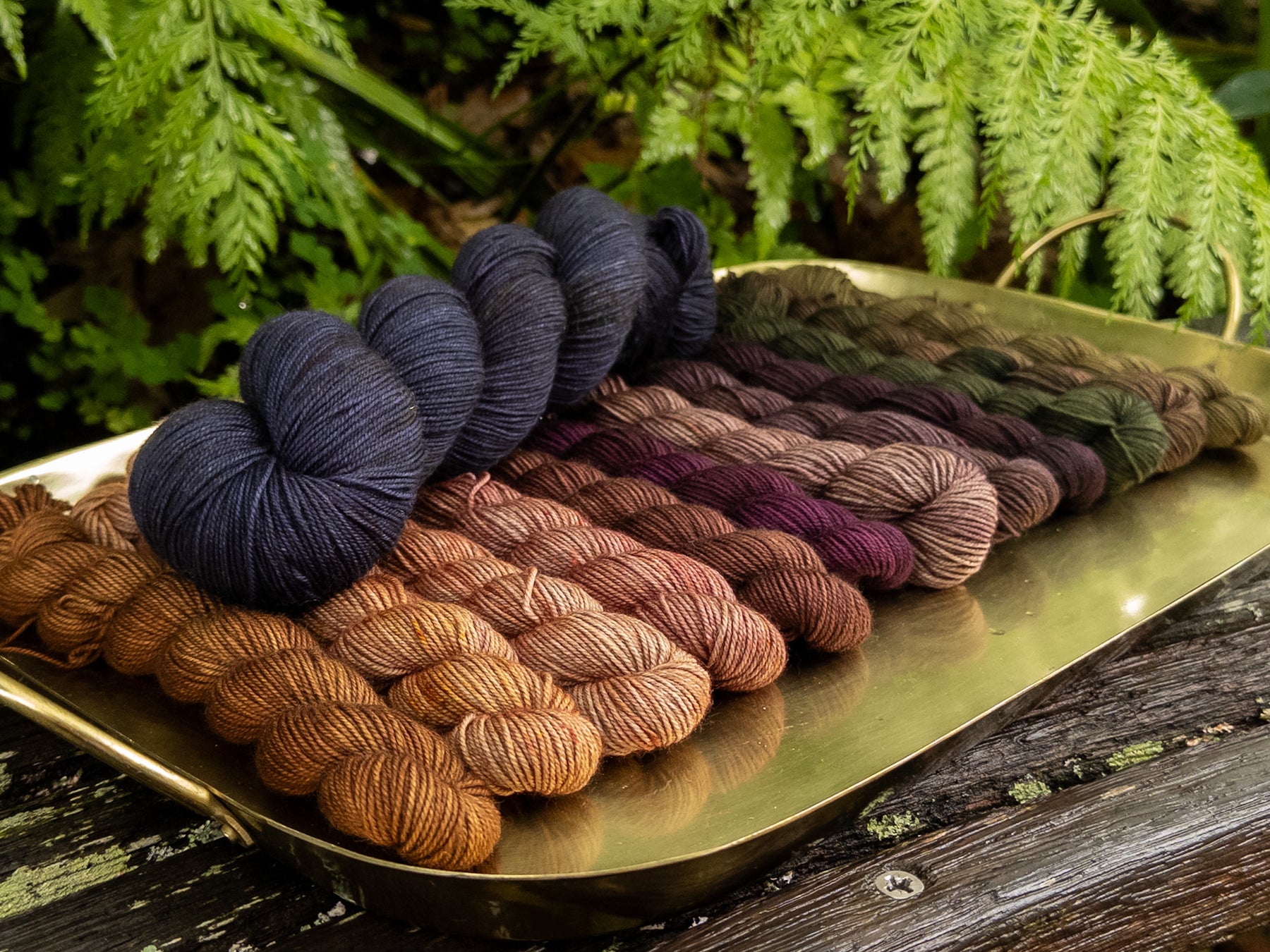 12x 20 gram skeins and 1x full 100 gram skein on Machinist 4ply. This base is made up of Merino/Yak/Nylon and is perfect for a variety of projects. Due to the yak content it is naturally moody and dark.