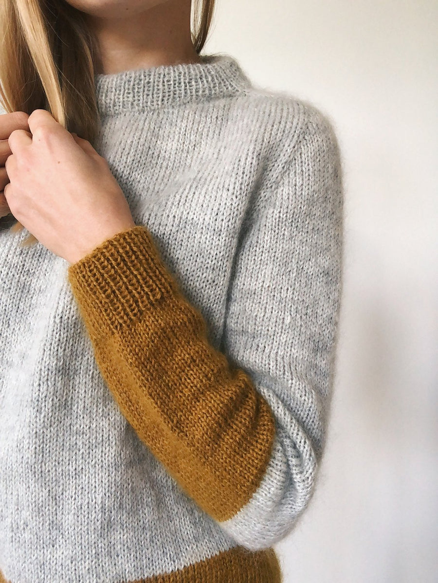 The Contrast Sweater is worked top-down seamlessly. The neck ribbing is folded over and seamed on the inside at the end - this is the only finishing required in addition to weaving in the ends. Short rows are used to shape the neck opening. The yoke is worked in three steps with three different increase techniques. The sleeves are worked in the round on double pointed needles or using the magic loop technique.