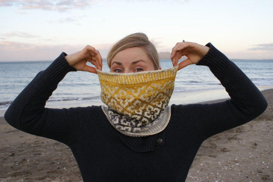 Ombeline cowl is seamlessly knit in-the-round with corrugated ribbing edges and a stranded colorwork body.