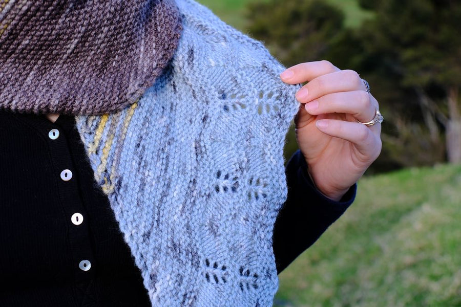 Prosper Shawl is a 3-skein DK weight fade shawl designed in collaboration with Prosper Yarn in order to highlight the beautiful Ānene DK fade sets.