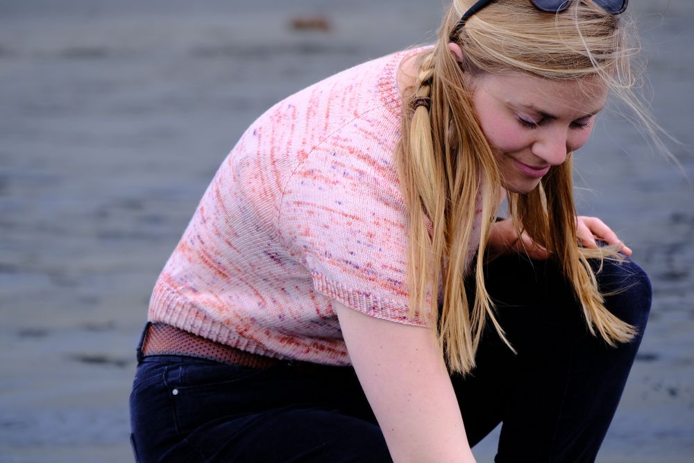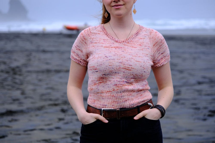 Rosewater Tee is a modern take on a classic retro style top with a comfortable fit and dramatically tapered ribbed waistline. Knit top-down using raglan sleeve shaping and a flattering crew neckline, this tee is bound to become a wardrobe staple for summer months and transitional weather.