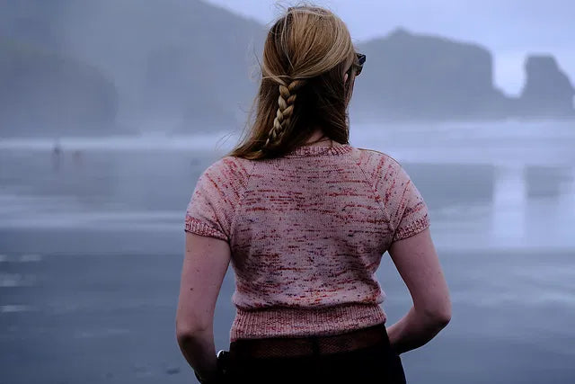 Rosewater Tee is knit from the top down seamlessly, with raglan-style sleeve shaping. It tapers in dramatically at the waist which is worked in twisted