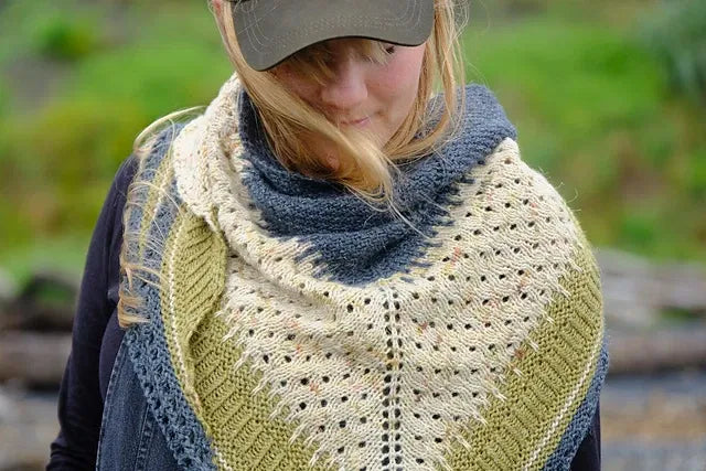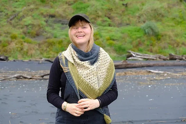 The Black Sands Shawl is a 3-colour shawl that uses fun texture, simple lace, slip stitch and colourwork motifs to play with 3 skeins of DK-weight yarn.