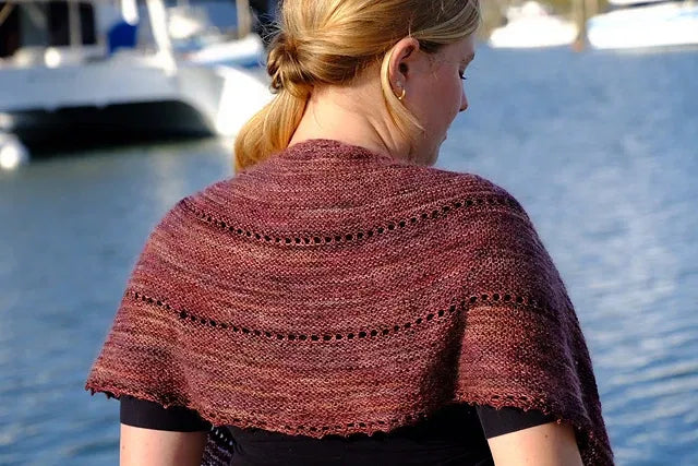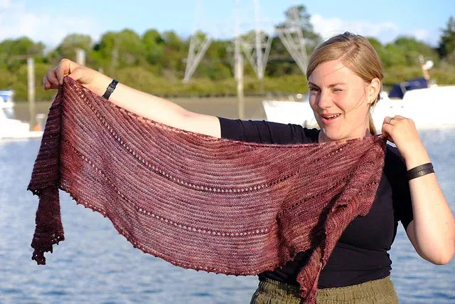 The Briar Rose Shawl uses one skein of sock yarn combined with one skein of mohair/silk for an elegant textured crescent-shaped shawl, with rows of sweet eyelets and a whimsical picot bind-off. I used the gorgeous moody tonal shades of Union Fibre hand-dyed yarn.