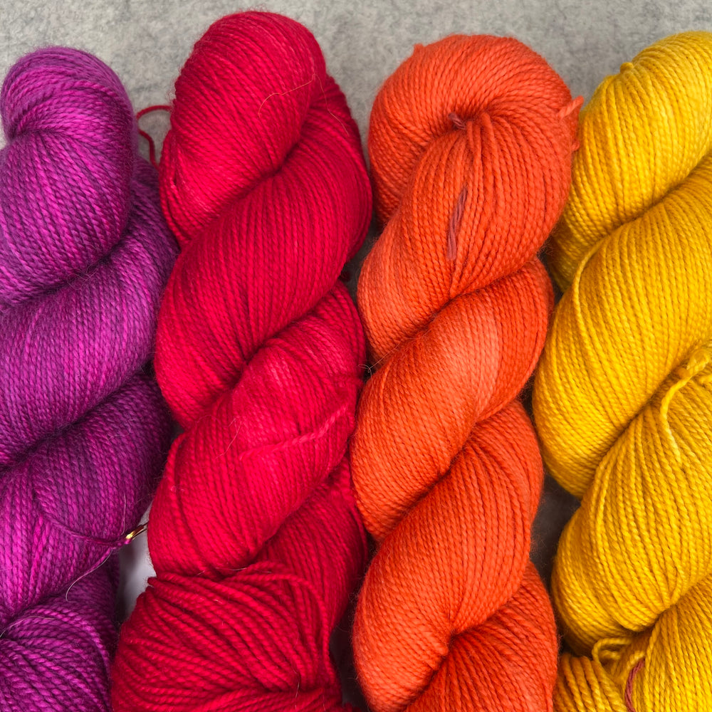 With this Kit you will get the 4 colours of 4ply Yarn and an email with the Digital Download of the Pattern sent via Ravelry directly to your email according to the above schedule. We have added a picture with a suggestion for the optional Mohair dare, the Mohair is not included in this kit.