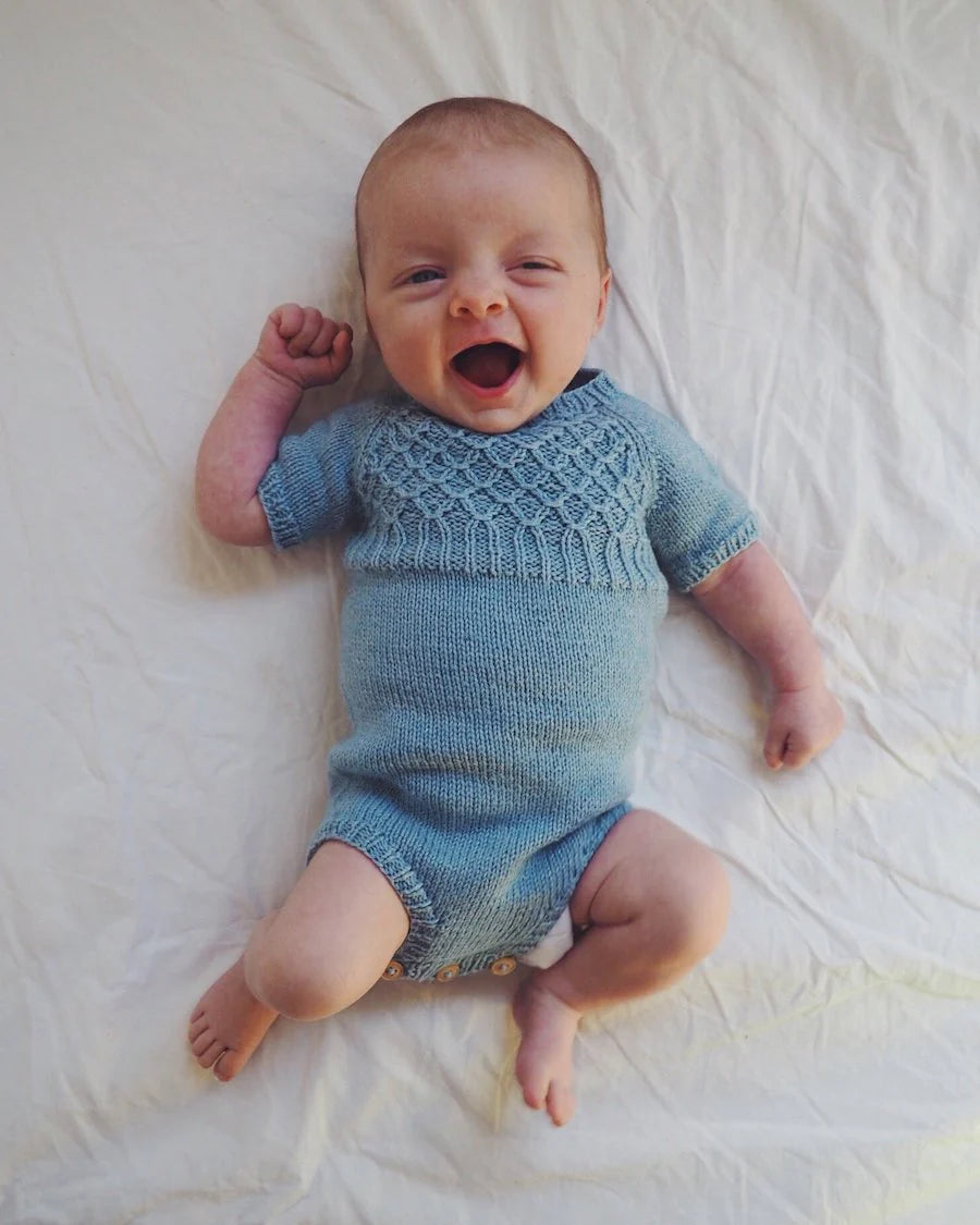 Milla's Summer Suit is inspired by the 1950's knits for kids, where the yoke was often worked in smocking st. The suit can easily be worn with leggings and a knit cardigan. Milla's Summer Suit is worked bottom up and the fit is snug.