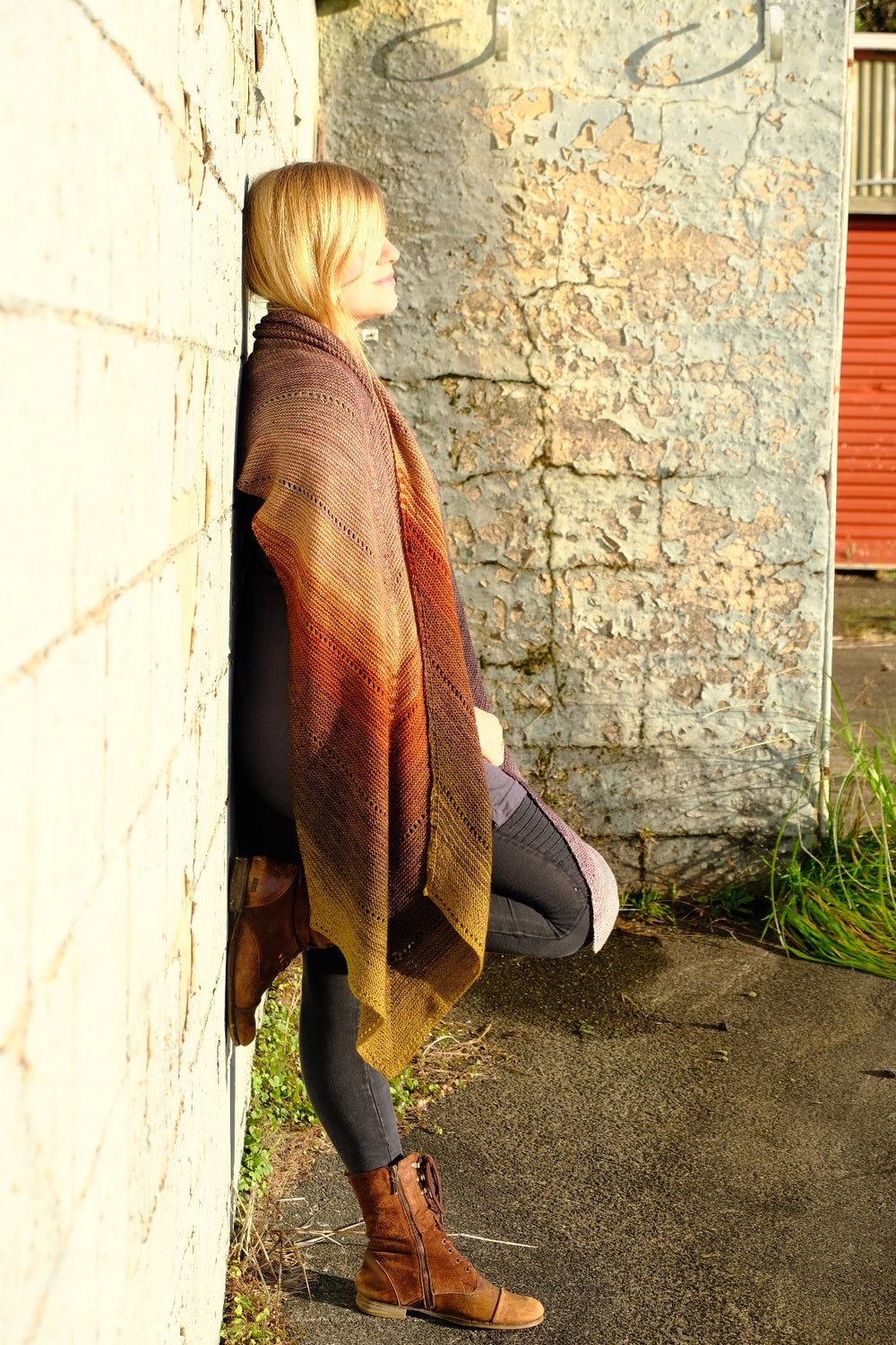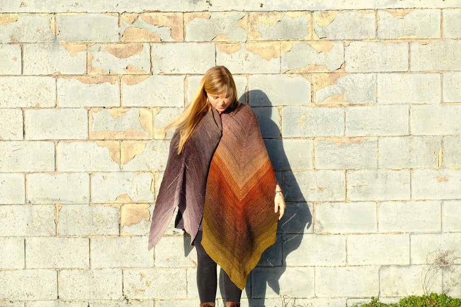 Knit sideways in a beautiful arrow shape, I wanted this shawl to be simple enough that it’s a relaxing knit, kept fun by the frequent color changes.