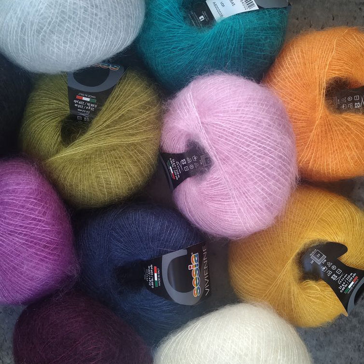 Sesia Vivienne is a lusciously soft and light blend of silk and mohair, with a dreamy halo to boot. This yarn is perfect for fine textured garments, or held double with a solid yarn to create chunky, fluffy knits.